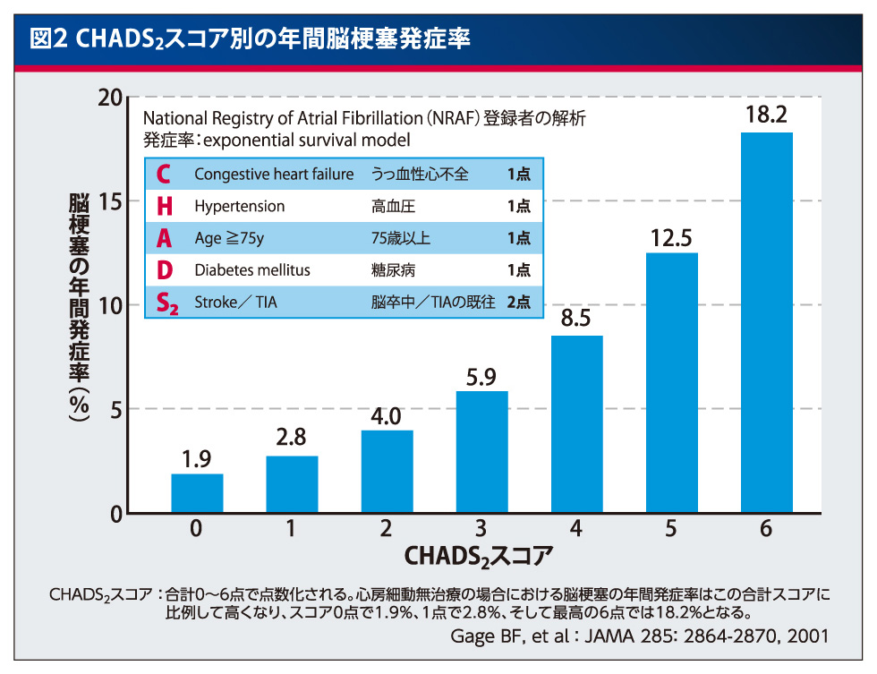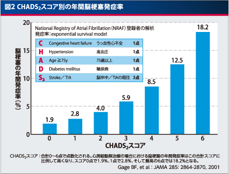 CHADS2スコアは、米国で考察されたリスク評価法ですが、日本人においてもこの評価法が有効であることがわかっており、臨床の現場では広く用いられています。最近のガイドラインでは、CHADS2スコア1点を含む脳梗塞リスクを有する非弁膜症性心房細動患者に抗凝固薬を推奨する流れにあるようです。実地臨床では、CHADS2スコア1点の患者は多く、また、心原性脳塞栓症は発症前のCHADS2スコアに関係なく一度の発作で重症化する可能性が高いことから、今後はひとりでも多くの心房細動患者を悲惨な脳梗塞からまもるために、低リスクの患者でもより積極的に抗凝固療法を行うことを普及させる必要があると思います。